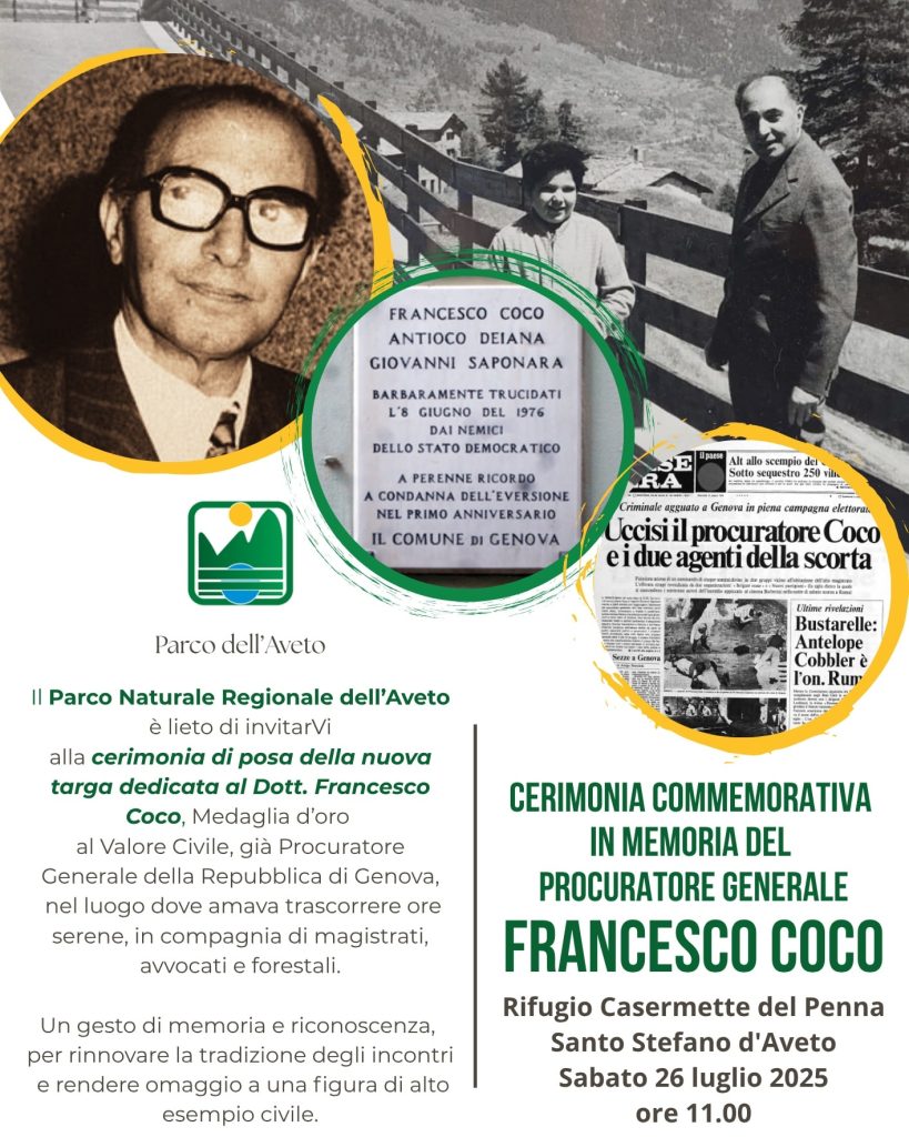 “Lì dove tornava per ritrovare la pace, oggi lo onoriamo per non dimenticare”. Il Parco dell’Aveto organizza un appuntamento speciale di memoria e giustizia in memoria di Francesco Coco, Medaglia d’Oro al Valore Civile, un uomo delle istituzioni.
