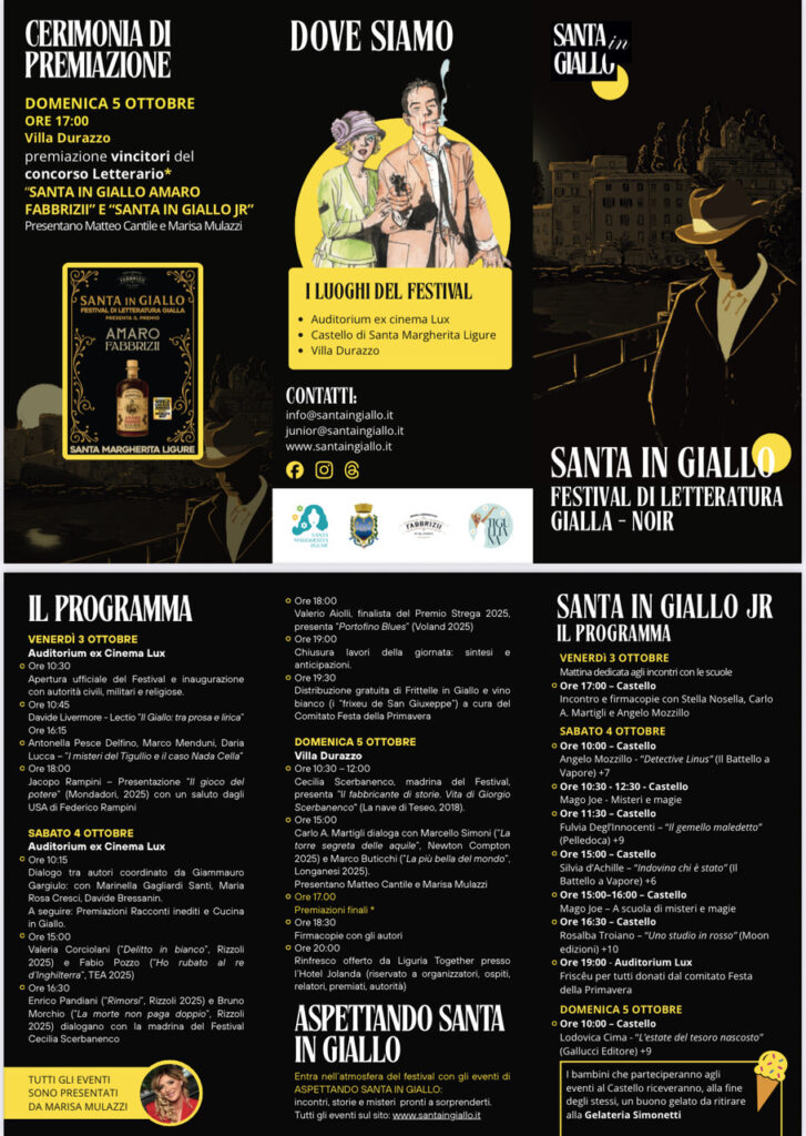 Dal 28 settembre al 5 ottobre Santa Margherita Ligure si tinge di giallo: lectio di Davide Livermore, madrina Cecilia Scerbanenco, tre giorni di incontri e una sezione Junior ricchissima. Finale a Villa Durazzo con la cerimonia di premiazione del Premio “Santa in Giallo – Amaro Fabbrizii” e firmacopie con gli autori.