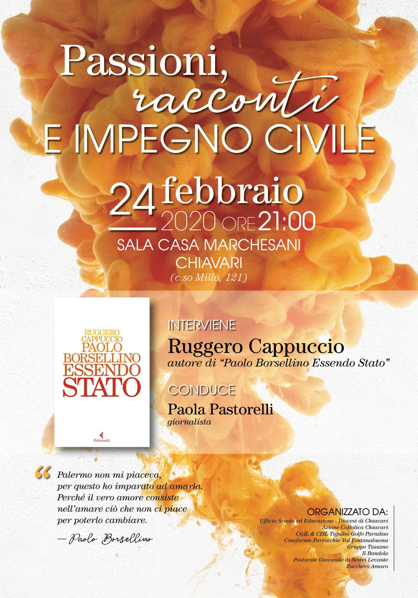 Il 24 e il 25 febbraio 2020 si svolgeranno a Chiavari due iniziative legate alla memoria di Paolo Borsellino con la presenza di Ruggero Cappuccio, scrittore, regista ed attore che ha dedicato al magistrato siciliano il libro “Essendo stato”.