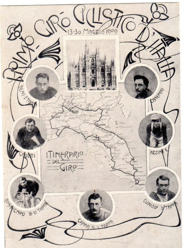 Solo pochi anni dopo giungerà la notizia del primo evento ciclistico nazionalpopolare: il Giro d’Italia. Nella prima edizione, organizzata tra il 13 e il 30 maggio del 1909, la tappa Firenze-Genova prevedeva il transito per Chiavari. La Gazzetta di Chiavari, uno dei tanti settimanali d’informazione cittadina, richiamava con forza l’evento: “Il desiderio di acclamare i forti campioni della gara ciclistica concorrenti al Giro d’Italia, hanno destato in Chiavari tale entusiasmo da sembrare matta. Le scuole ebbero vacanza e i battenti della Corte d’Assise vennero aperti con ritardo. Mentre una folla di persone in bicicletta e a piedi accorreva alla salita delle Grazie, per meglio godere lo spettacolo degli sfidanti l’erta aspra del monte, altra numerosa falange di spettatori si assiepava al traguardo volante di Corso Dante e lungo Via Vittorio Emanuele”.