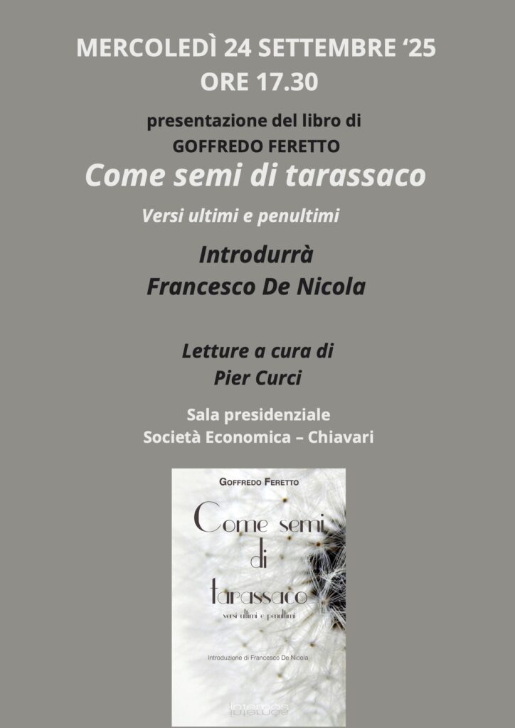 Mercoledì 24 settembre, alle ore 17,30, presso la Società Economica di Chiavari, sarà presentato “Come semi di tarassaco – Versi ultimi e penultimi”, libro di poesie del chiavarese Goffredo Feretto. Letture a cura di Pier Curci. Su concessione della casa editrice Internòs, pubblichiamo l’introduzione firmata dal docente universitario Francesco De Nicola.