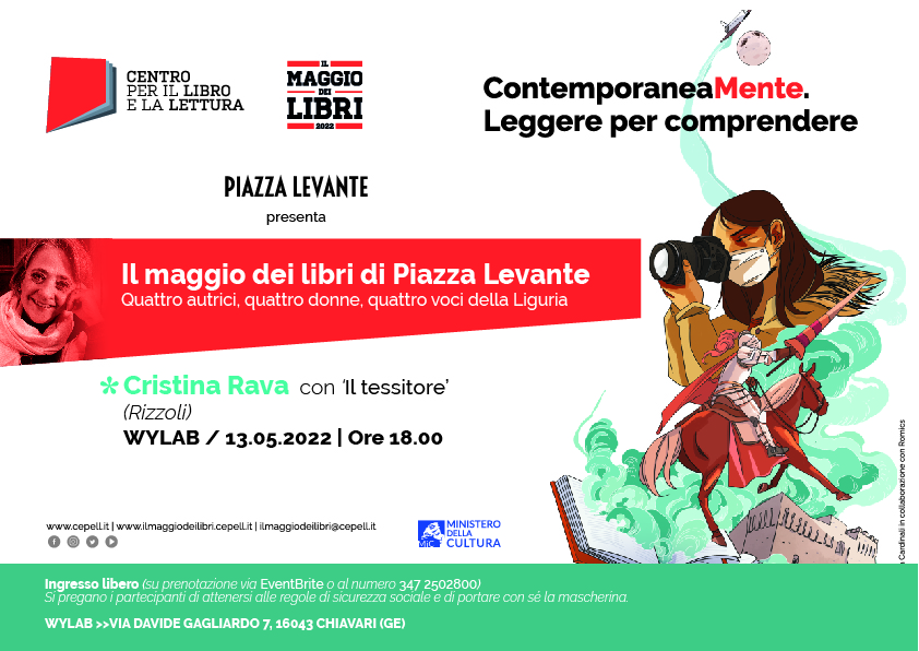 L’intervista con Cristina Rava fa parte del ciclo ‘Il maggio dei libri di Piazza Levante’: una serie di incontri dal vivo, presso la sede di Wylab in via Davide Gagliardo 7 a Chiavari, che rientra nell’ambito degli appuntamenti de ‘Il maggio dei libri’, la grande rassegna di livello nazionale promossa dal Centro per il libro e la lettura del Ministero dei Beni e delle Attività Culturali e del Turismo.