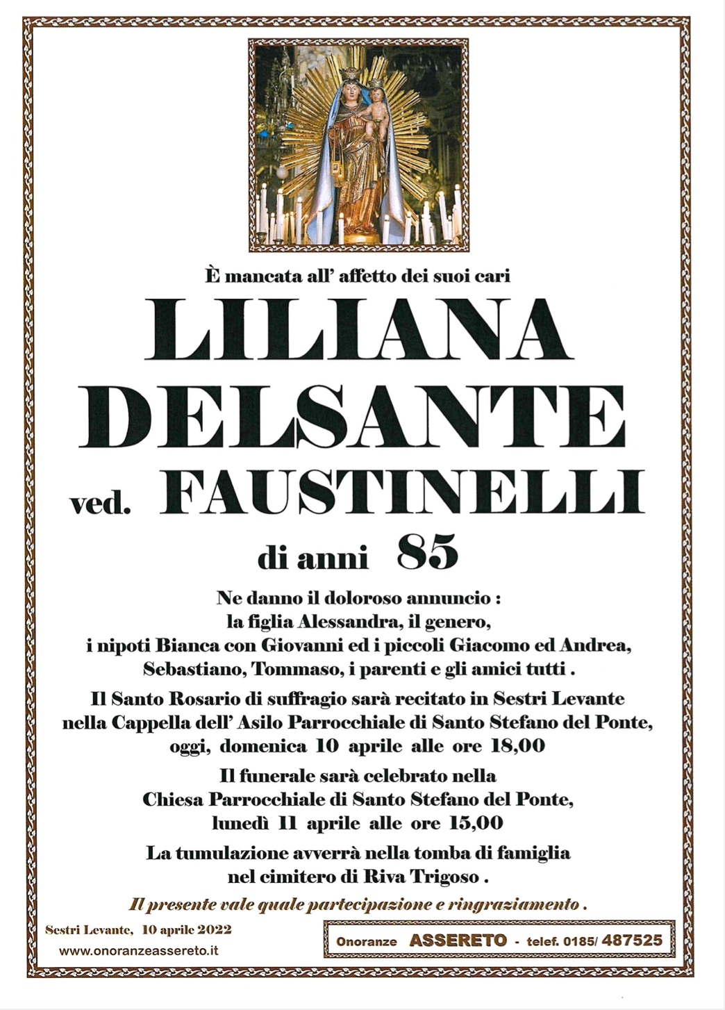 Sestri Levante, addio a Liliana Delsante