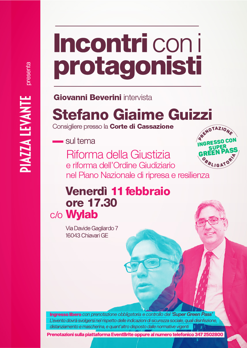 L’invito di ‘Piazza Levante’ al dottor Stefano Giaime Guizzi a discutere con noi il tema ‘Riforma della Giustizia e riforma dell’Ordine giudiziario nel Piano Nazionale di ripresa e resilienza’, nell’intervista pubblica che sarà condotta presso Wylab dall’avvocato Giovanni Beverini, appare particolarmente puntuale e tempestivo.
