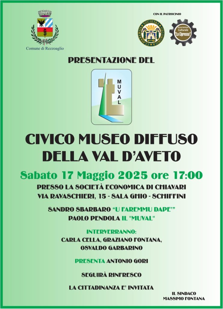 Nasce il Museo della Val d’Aveto. Un progetto ambizioso e pronto ad arricchirsi di nuove pagine che verrà presentato sabato 17 maggio alle 17 presso la Società Economica di Chiavari. “A differenza di un museo tradizionale, chiuso entro spazi fisici delimitati, il Muval è un museo diffuso, un luogo aperto che si identifica con l’intero territorio comunale di Rezzoaglio – spiegano dall’amministrazione comunale – Ogni monumento, edificio storico, angolo del paese o testimonianza architettonica diventa parte integrante del percorso museale. Il territorio stesso è museo, vivo e accessibile, capace di raccontare la propria storia attraverso i luoghi, le persone e le tradizioni che lo abitano. Il Muval è un progetto volto alla valorizzazione del patrimonio culturale e della memoria storica del nostro territorio”.