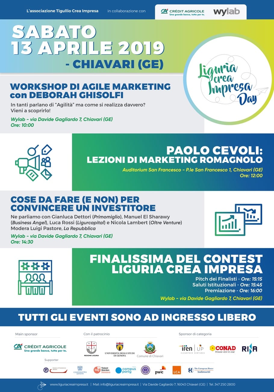 Ecco perché il simpatico comico romagnolo (è originario di Riccione e si definisce spesso “imprenditore con l’hobby del cabaret”) è stato invitato al Liguria Crea Impresa Day, il grande atto finale del contest per idee imprenditoriali organizzato da Wylab e dall’Associazione Tigullio Crea Impresa e giunto alla sua terza edizione, dopo esser partito da Chiavari ed essersi allargato a poco a poco, dal Tigullio all’intera regione.