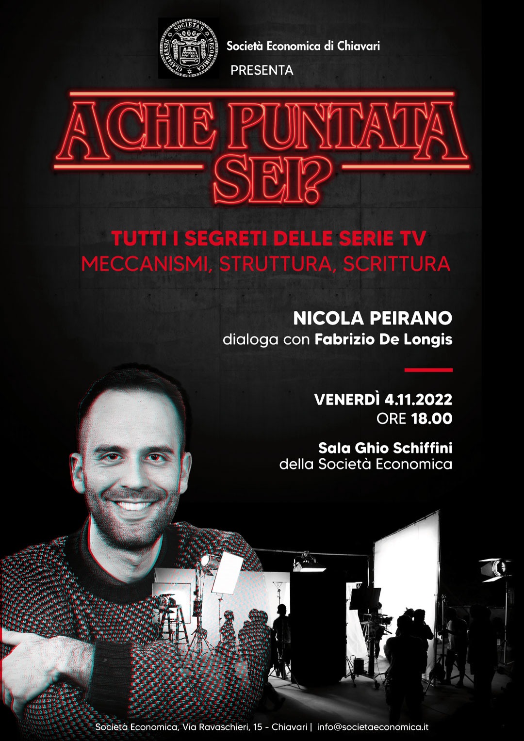 “Questa vuole essere una sorta di ‘puntata zero’ di un approfondimento sul fenomeno delle serie tv, e si rivolge a chiunque abbia qualche interesse per questa forma artistica ormai divenuta letteratura dominante del nostro secolo. Successivamente in base alle adesioni prenderà vita un vero e proprio corso gratuito di formazione per capire e studiare al meglio il tema delle serie tv, e magari chissà, anche provare a scriverne una”. L’ingresso all’appuntamento di venerdì è libero. A intervistare Nicola Peirano sarà il giornalista Fabrizio De Longis.