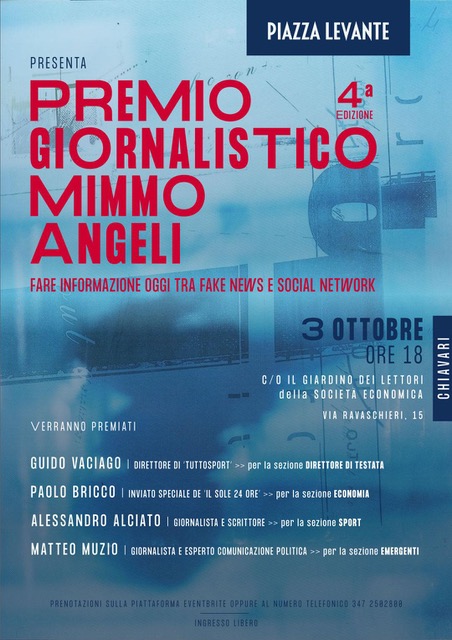 L’appuntamento è per domani, 3 ottobre, alle 18, alla Società Economica in via Ravaschieri 15 a Chiavari. L’evento, a ingresso libero, sarà preceduto da un dibattito sul tema di grande attualità: “Fare informazione oggi tra fake news e social network”.