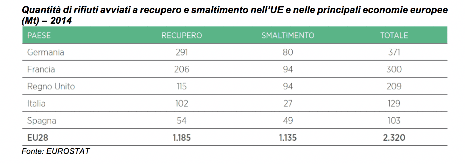 I flussi più rilevanti per l’Italia sono rappresentati dai rifiuti riciclabili tradizionali (carta, plastica, vetro, metalli, legno, tessili): 26 milioni di tonnellate; seguono i rifiuti misti avviati a selezione (14 milioni), i rifiuti organici e verdi (6 milioni) e i rifiuti chimici (1,7 milioni). L’Italia è anche il secondo Paese europeo, dopo la Germania, in termini di fatturato e di addetti nel settore della preparazione al riciclo.