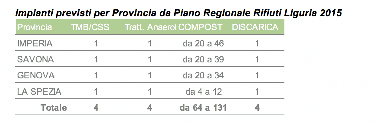 Per tentare di correre ai ripari, la Regione Liguria ha approvato con dcr n.14 del 25 marzo 2015 il Piano regionale di gestione dei rifiuti e i documenti di pianificazione di dettaglio connessi; la cui strategia è costituita da alcuni punti cardine: superamento della frammentazione gestionale, incremento della raccolta differenziata finalizzata al recupero ed al riciclaggio dei rifiuti, sostituzione degli impianti di smaltimento con impianti di trattamento in grado di valorizzare le componenti del rifiuto e limitare al minimo le frazioni residue (v. tabella).