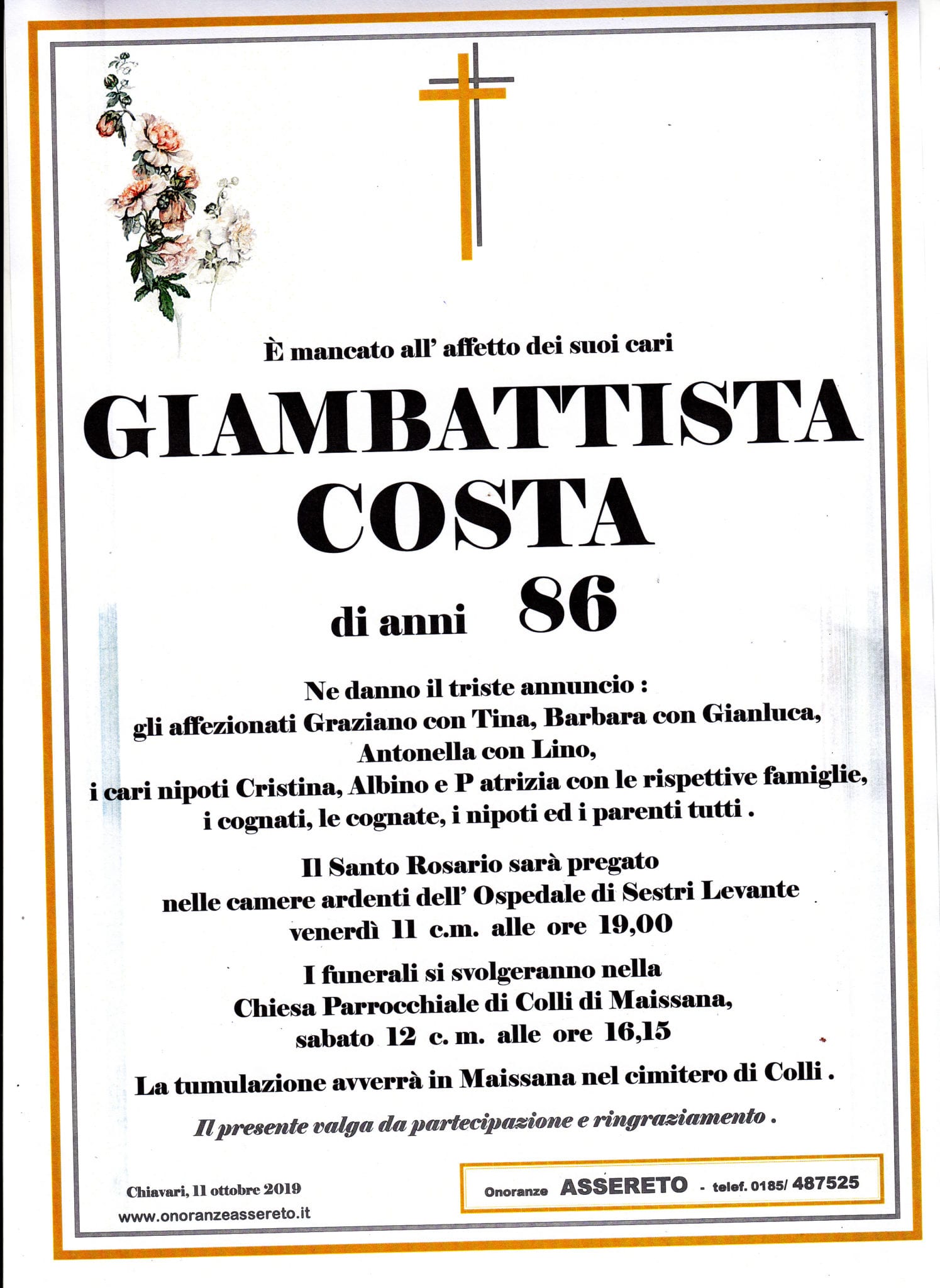 Sestri Levante, addio a Giambattista Costa